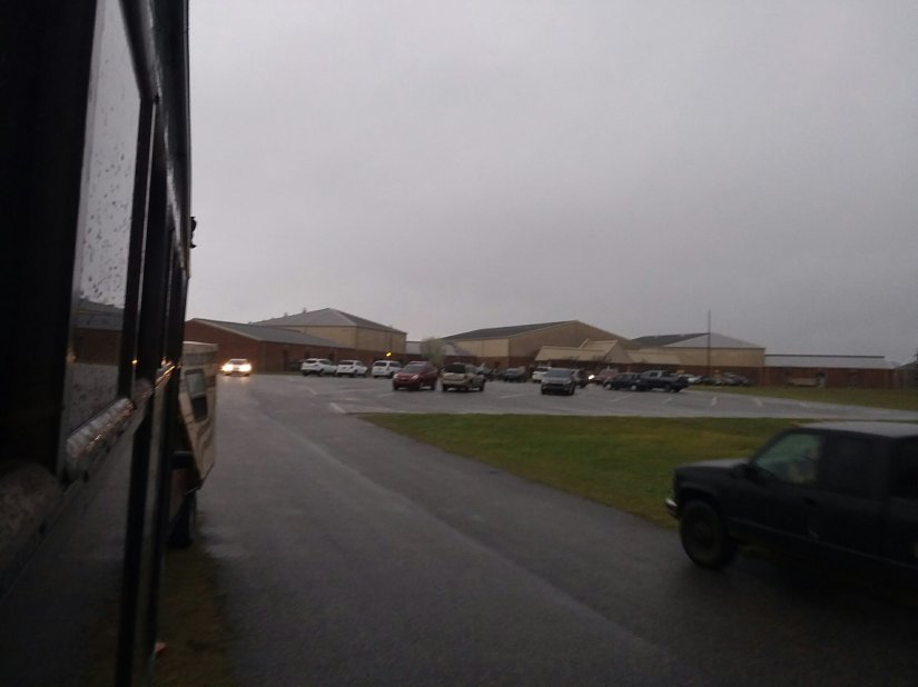We stopped for the night at about 10:30. Billy thought it was a church parking lot, but when we woke up in the morning, we realized it was an elementary school! So all the parents dropping their kids off at school got to read the bus.